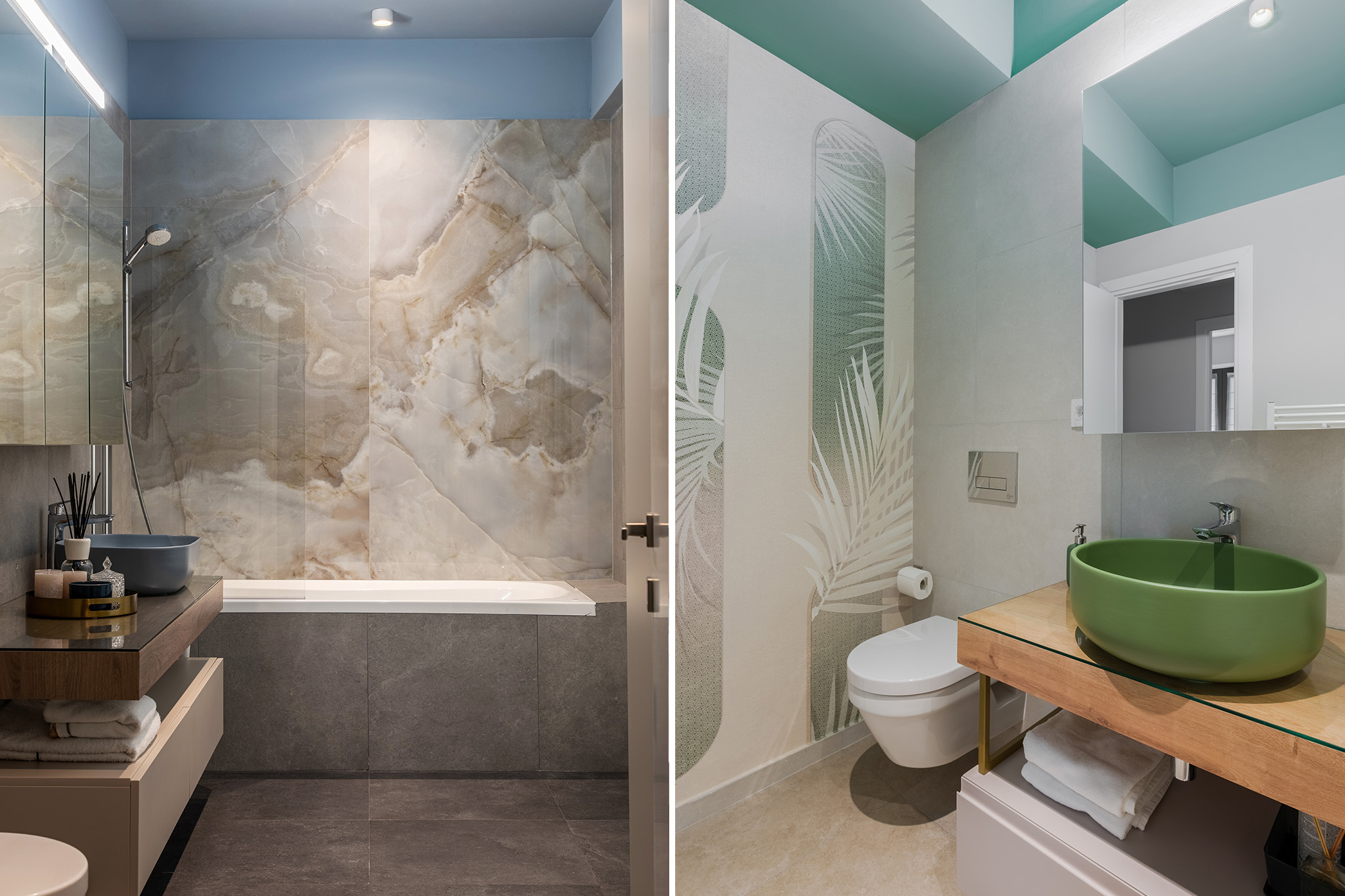 Băile sunt de cele mai multe ori gata finisate și echipate, așadar, alegem să intervenim minim, realizând un perete de accent, suplimentând lumina și spațiile de depozitare.