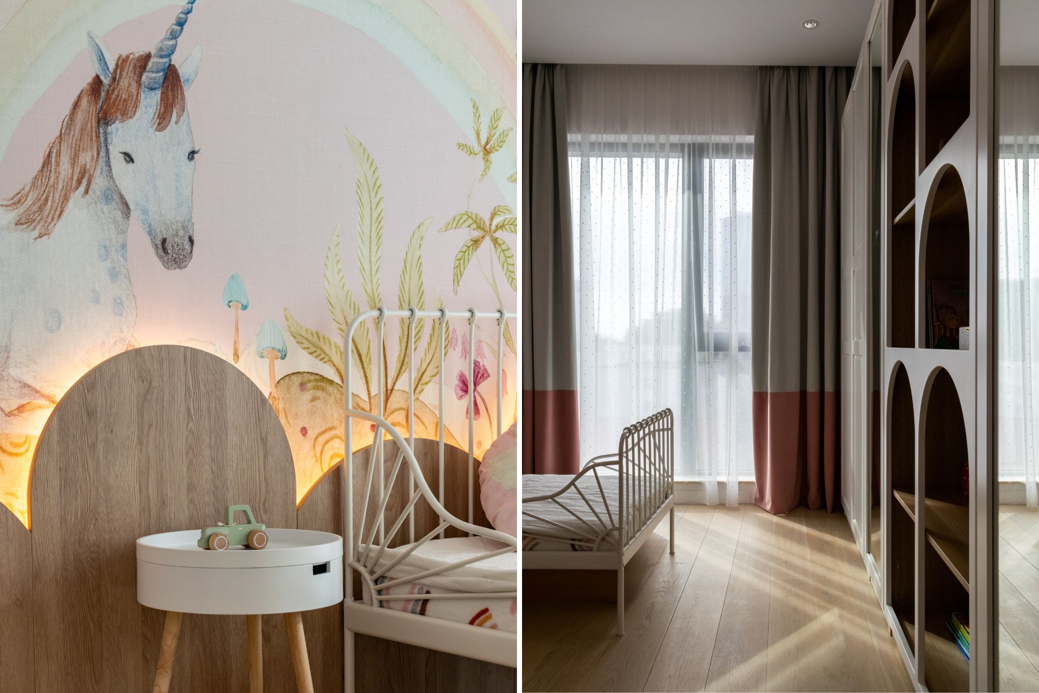 Dormitorul fetițelor devine poarta către un univers de basm, conturat cu ajutorul tapetului înfățișând motive fantastice, și aspiră să fie un mic colț al bunăstării și al copilăriei. Liniile curbate se întind armonios în întreaga încăpere, subliniate de placajul retroiluminat de pe peretele decorat cu tapet, de unde personajele fantastice par să prindă viață. Rafturile deschise, cu fronturi perforate, oferă copiilor posibilitatea să își așeze singuri lucrurile, creând astfel senzația unui turn de castel cu ferestre înalte.