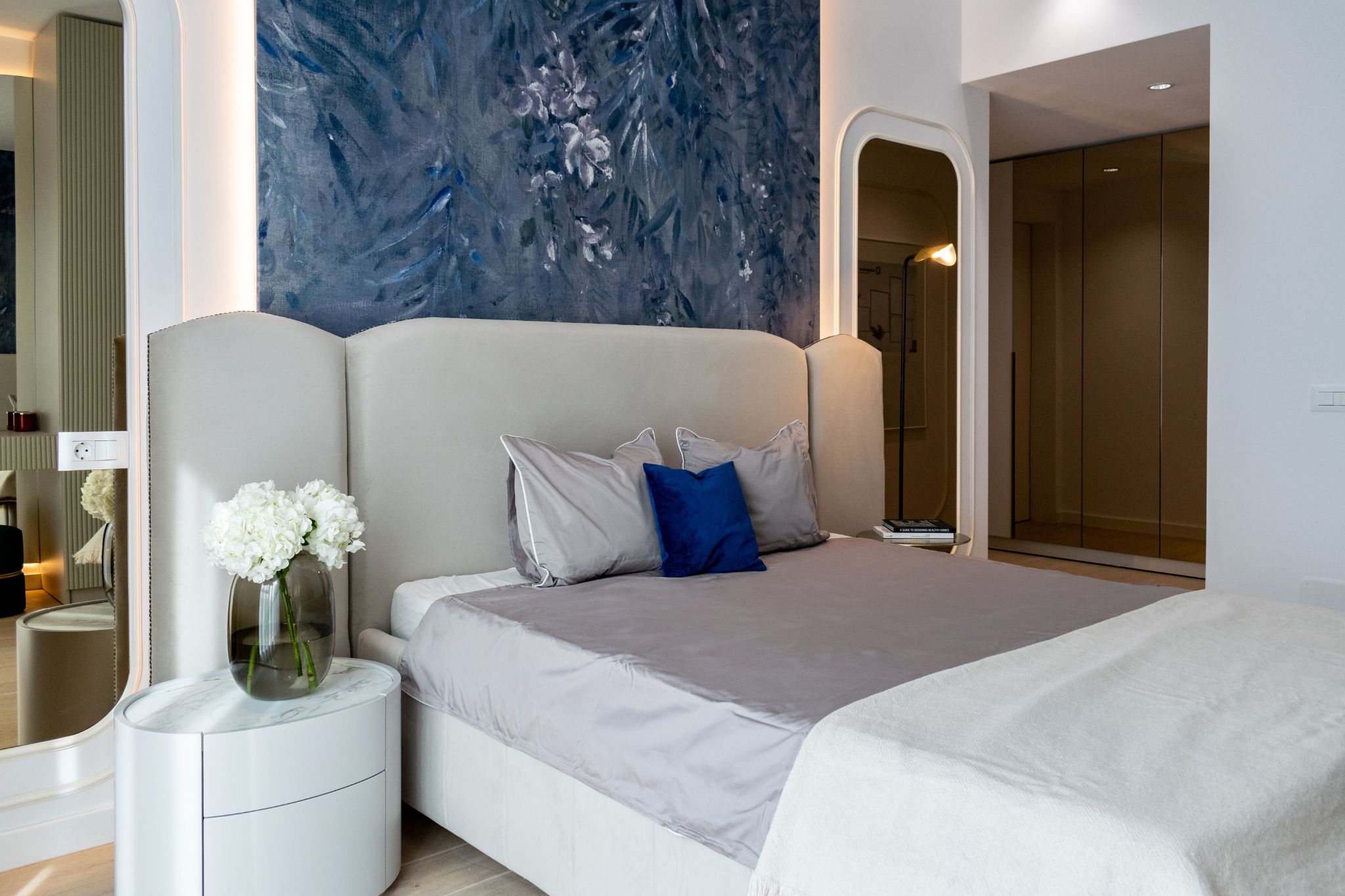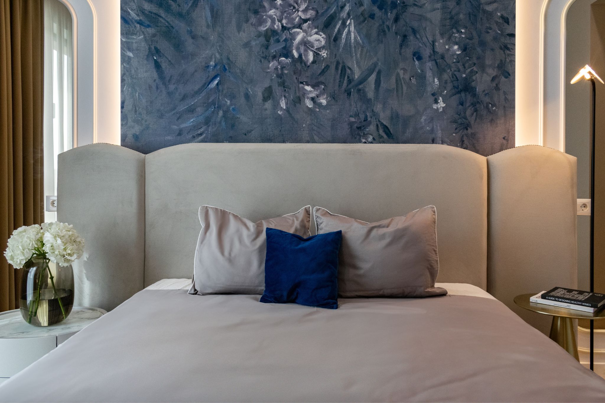 În dormitorul matrimonial, albastrul introduce o notă de regalitate și de “reverie”, prin intermediul tapetului floral din spatele patului, completată subtil cu nuanțe din aceeași paletă.