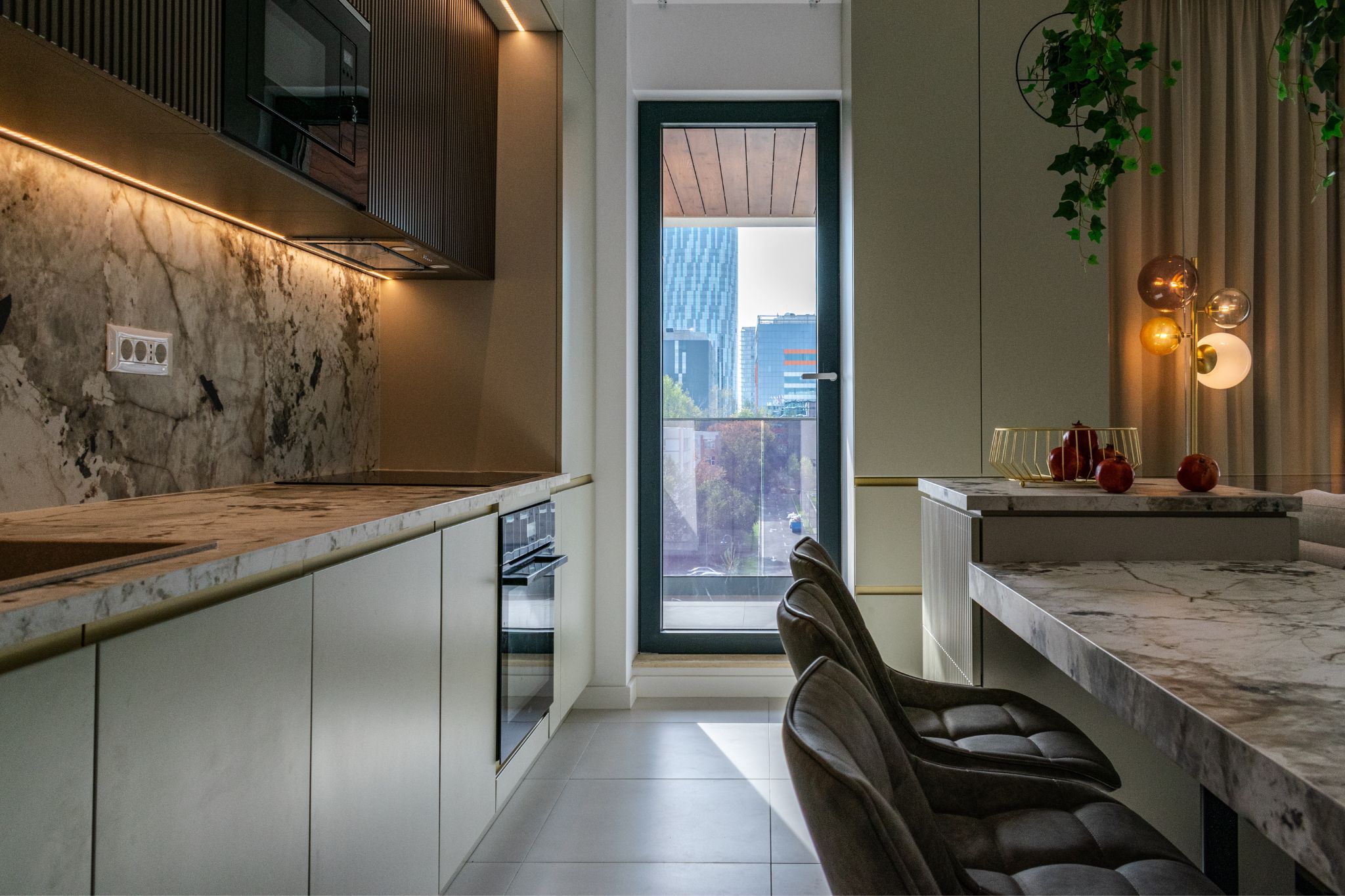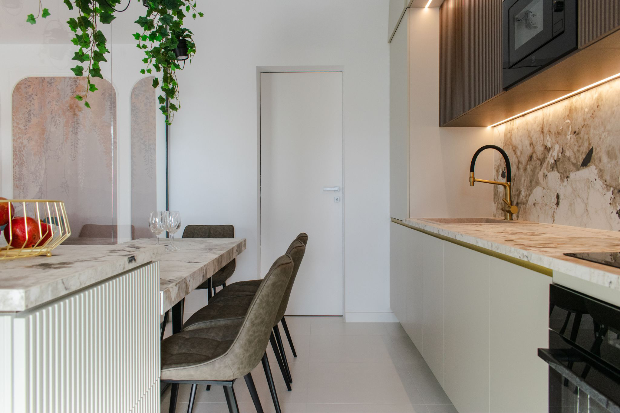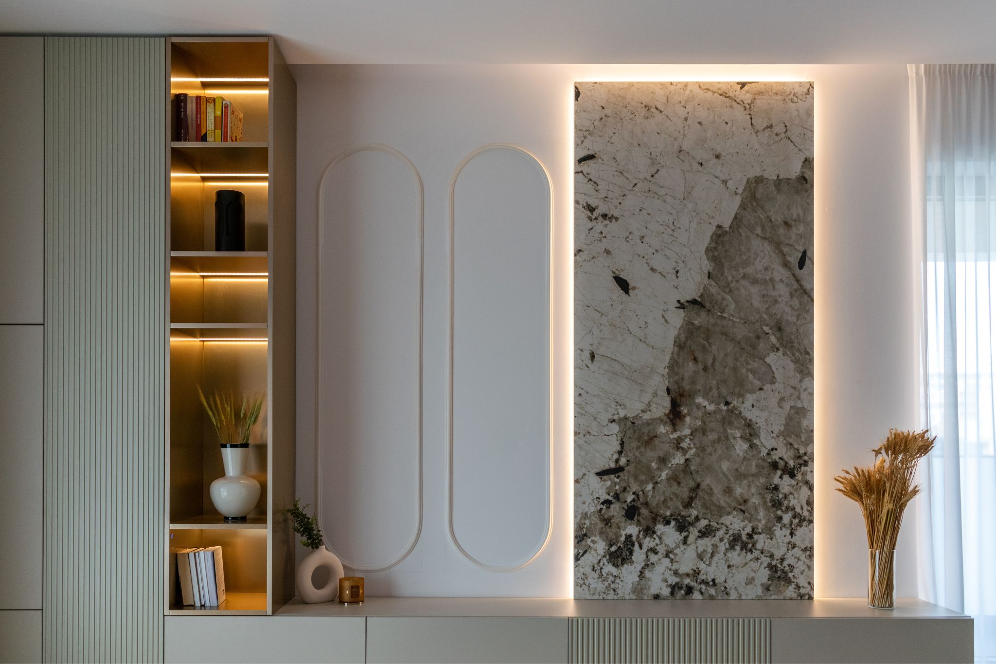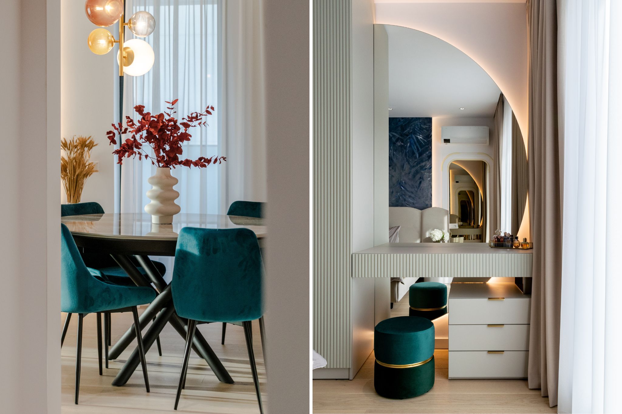 Astfel, în toate aceste spații regăsim accente aurii ce conferă eleganță și rafinament, atât la nivelul mânerelor, canturilor de oglinzi, cât și la nivelul rafturilor deschise din living.